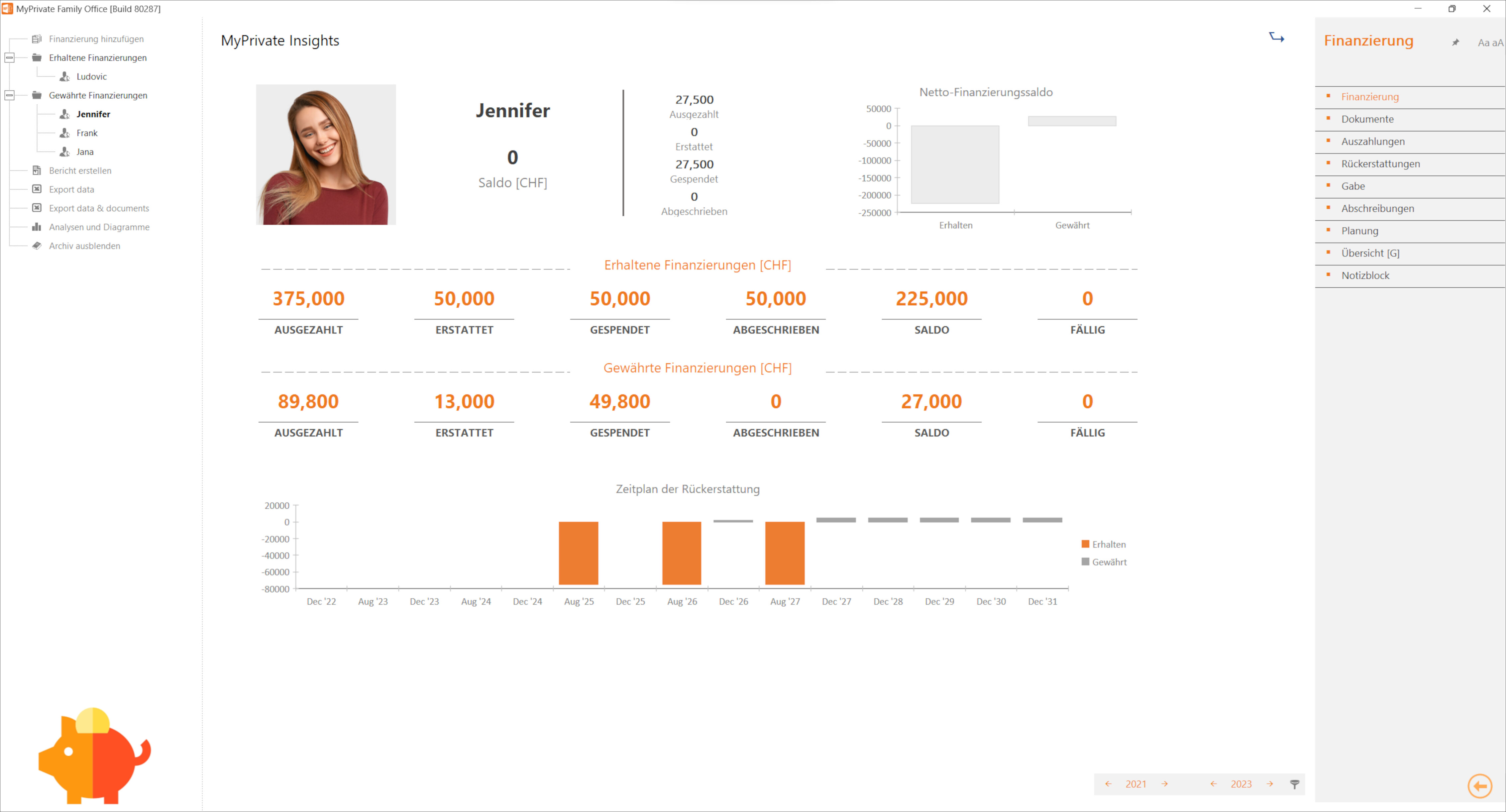 Das Modul "Finanzierung" hilft dabei, den Überblick über gewährte und erhaltene Darlehen zu behalten, sowohl in bar als auch in Form von Sachleistungen, wobei der Schwerpunkt auf der Finanzierung innerhalb der Familie liegt.